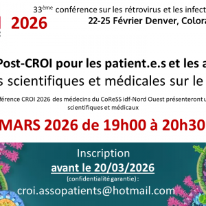 A l’occasion de la CROI 2026 (33ème conférence sur les rétrovirus et les infections opportunistes du 22 au 25 Février 2026 à Denver, Colorado), des médecins des CoReSS IDF Nord-Ouest présenteront une sélection de sujets scientifiques et médicaux, le 25 mars 2026 de 19h à 20h30. Participation gratuite sur inscription avant le 20 mars 2026, […]